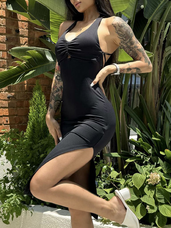 ZASUWA Female Solid Color Cross Back Hollow Out Split Dress