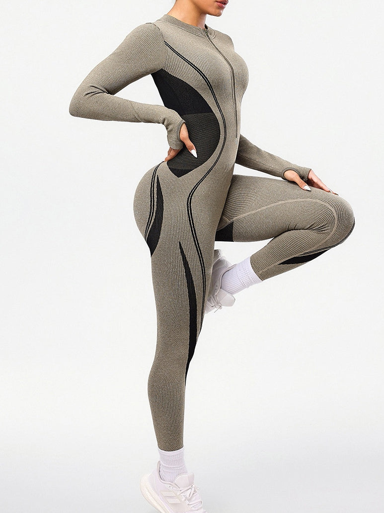 ZASUWA Female Contrast Color Stand Up Collar Zipper Elastic Tight Jumpsuit