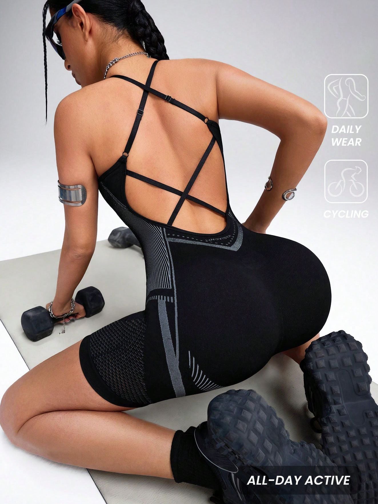 ZASUWA Female Hollow Out Net Cross Back Elastic Tight Romper