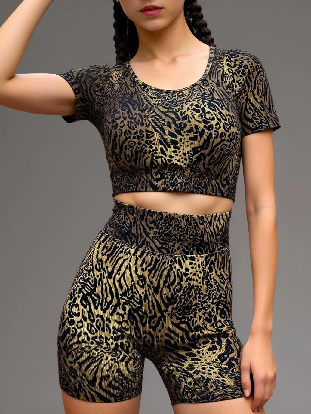 ZASUWA Female Leopard Print U Collar Short Tracksuit