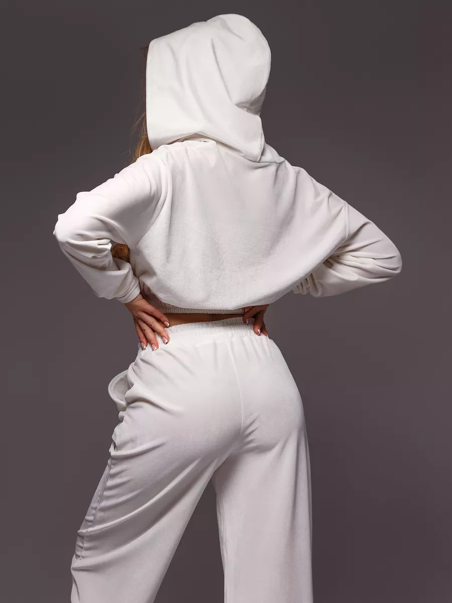 ZASUWA Female Velvet Zipper Pocket Hooded Casual Cropped Tracksuit