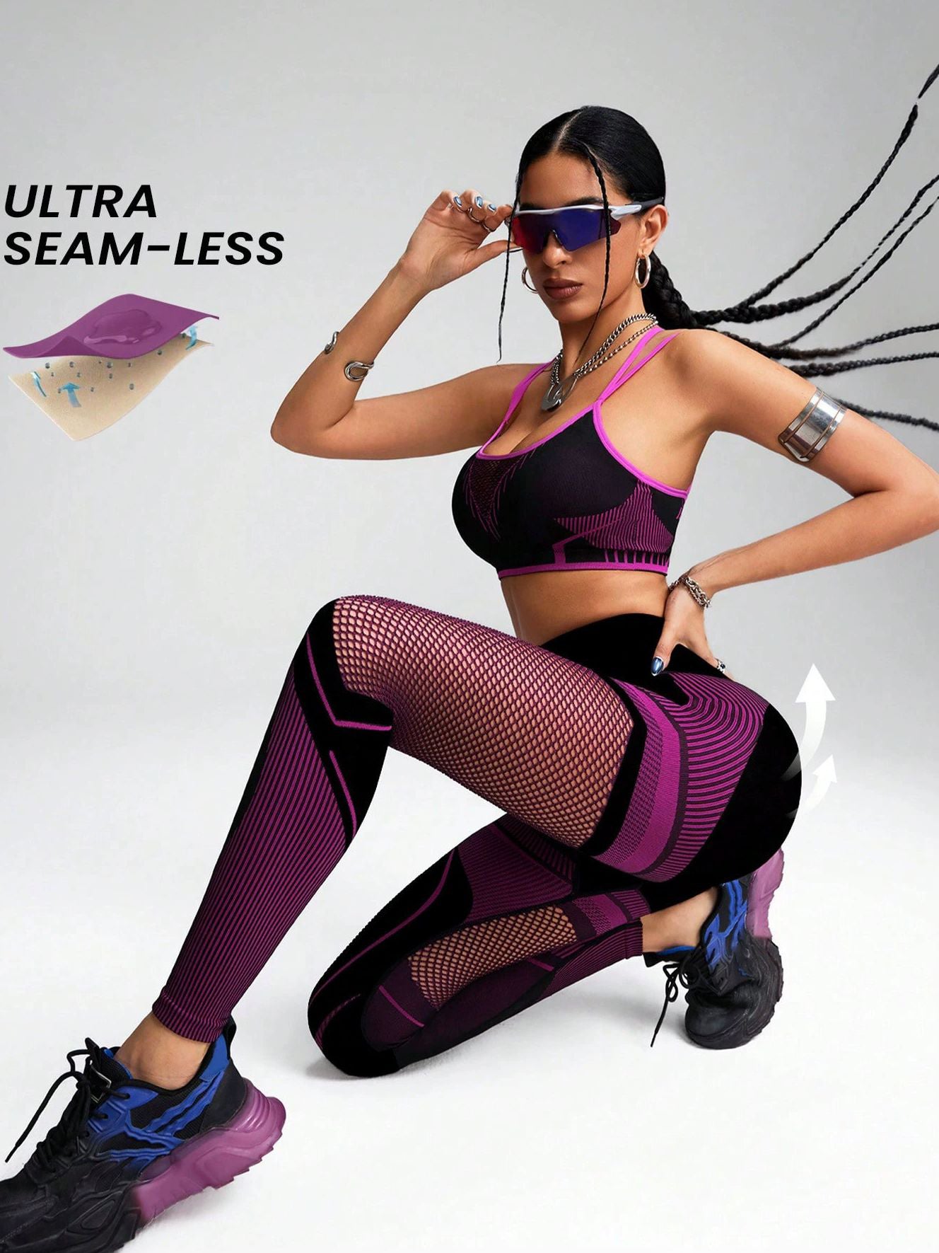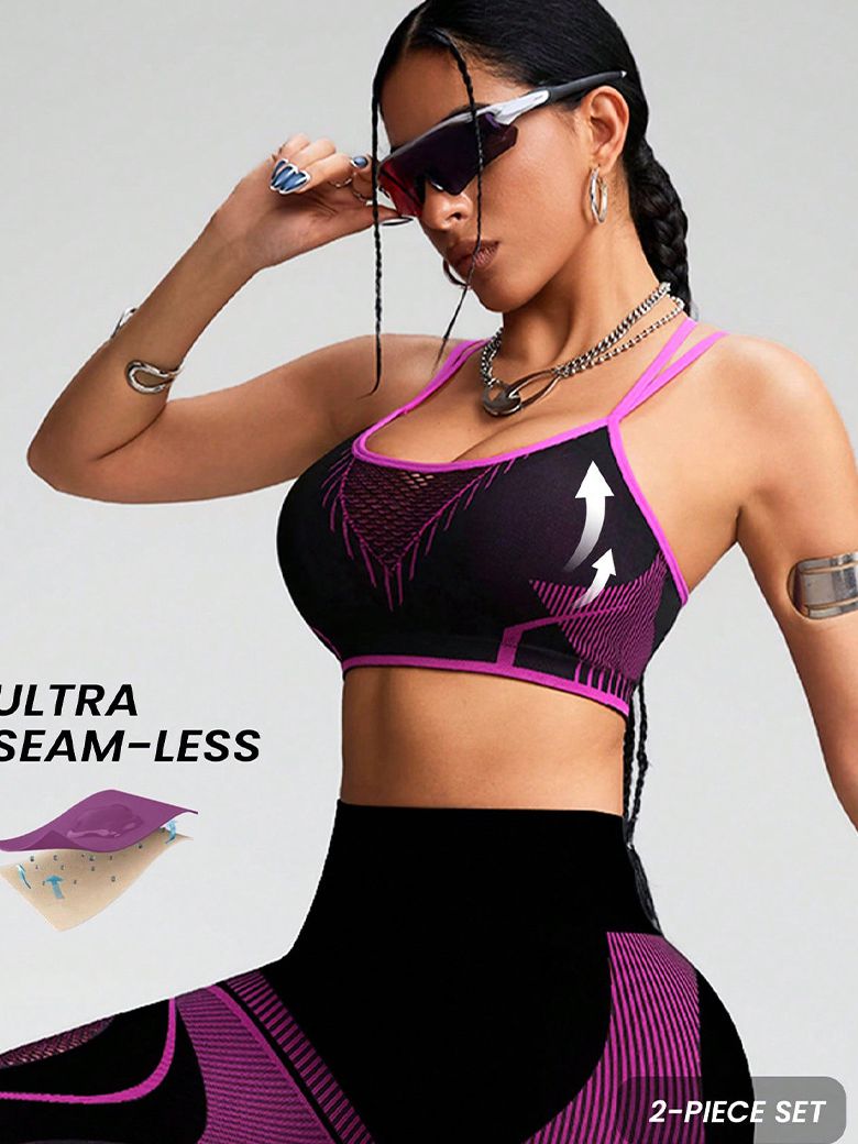 ZASUWA Female Contrast Color Fishnet Cross Back Stripe Print Push Up Design Tracksuit