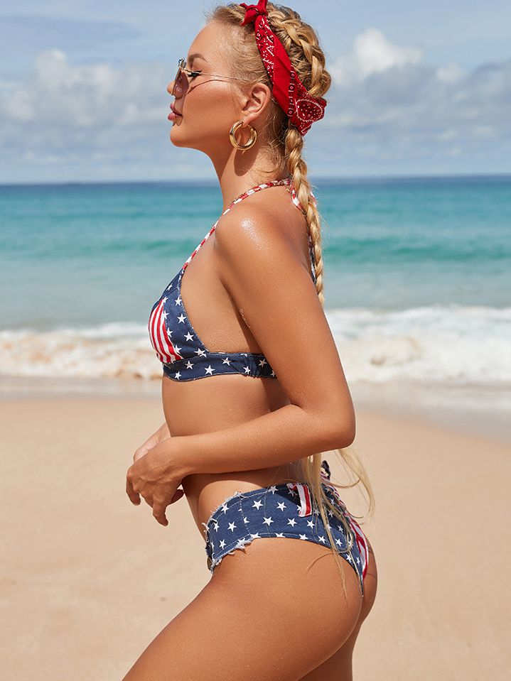 ZASUWA Female Sexy Flags Print with Metal Buttons Backless Scrunch Bum Beach Bikini Set