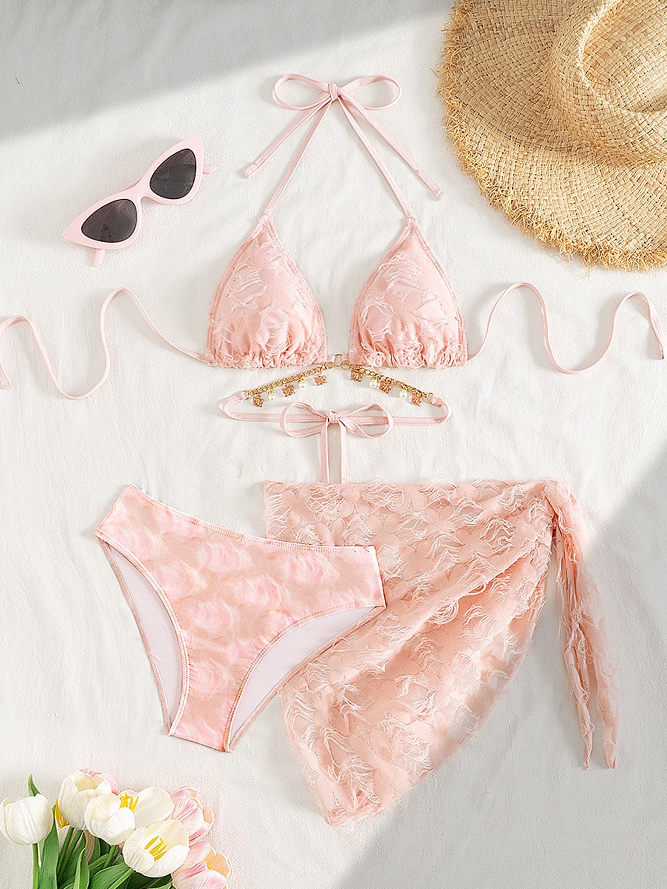 ZASUWA Female Sexy 3 Pieces Petal Mesh Metal Chain Beach Bikini Set
