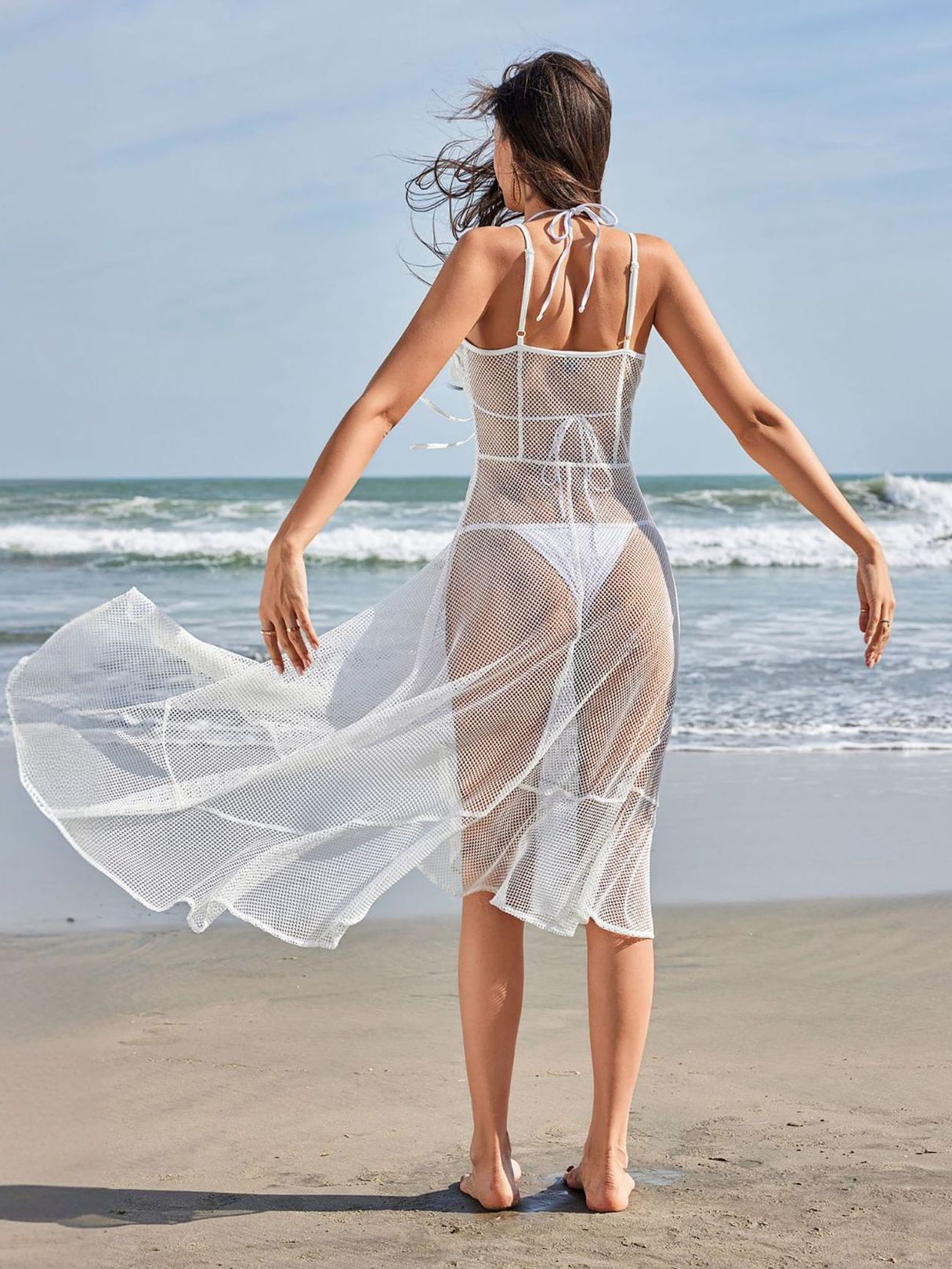 ZASUWA Female Sexy Fishnet Flower V-neck Swimwear Cover Dress Without Bikini