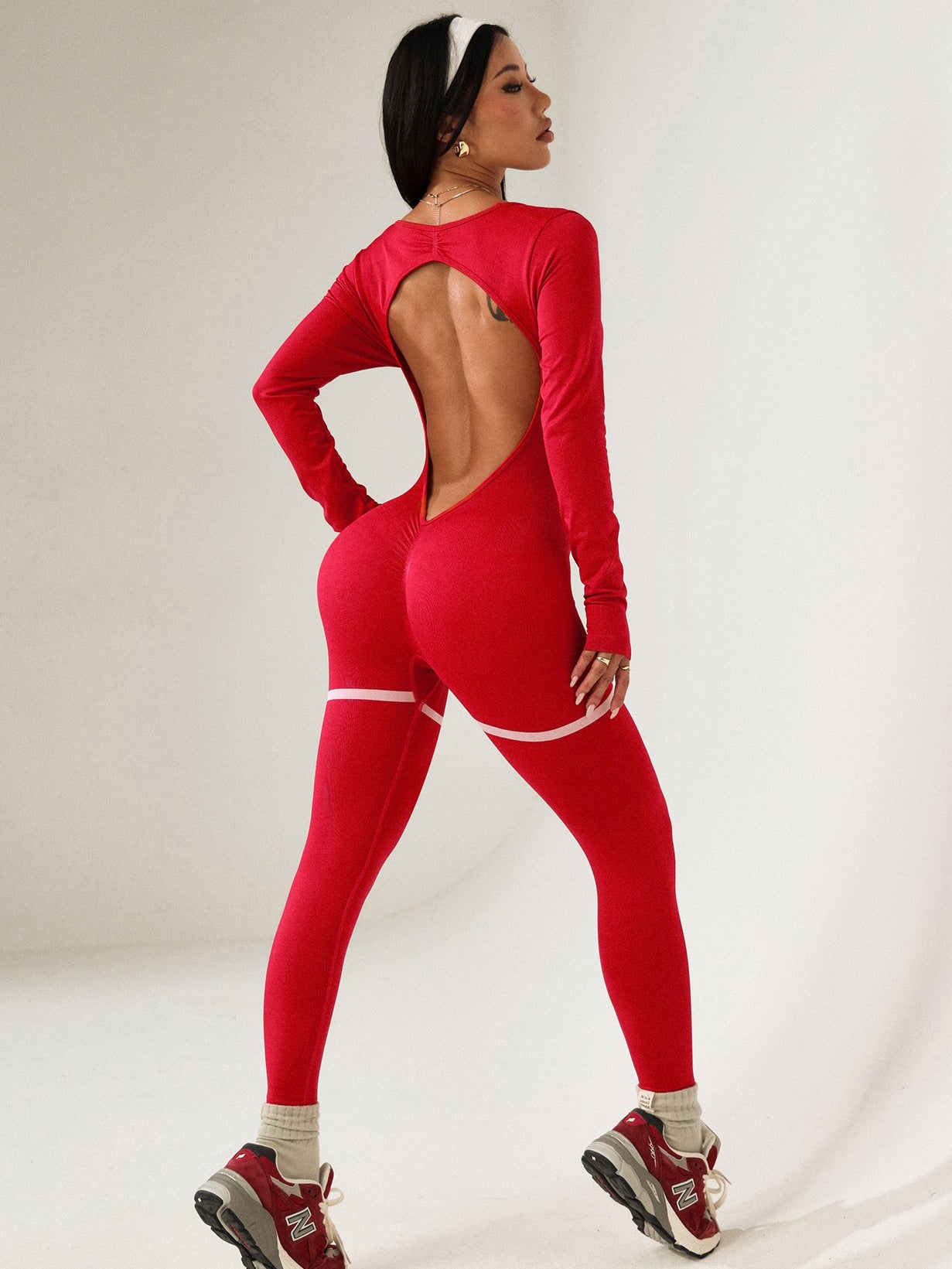 ZASUWA Female Backless Ribbed Deep V Back Long Sleeves Jumpsuit