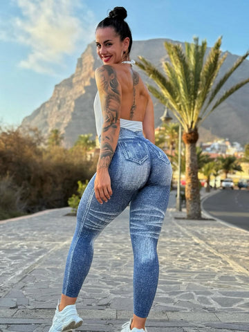 ZASUWA Female Deep V Back Denim Scrunch Bum Leggings