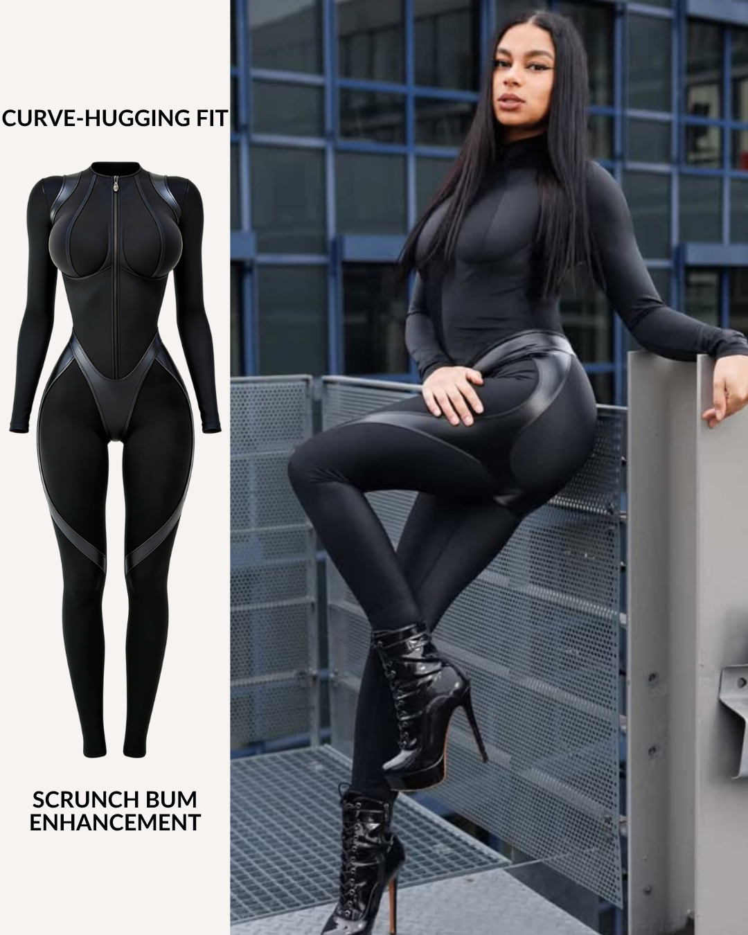 "SciFi Heroine" Contrast Color PU Half Zipper Jumpsuit