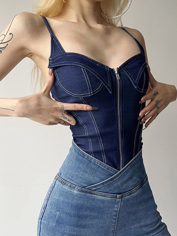 ZASUWA Female Sexy Denim Zipper Push Elastic Tight Bodysuit