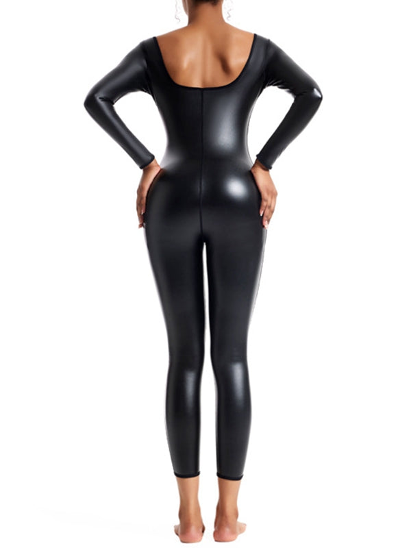ZASUWA Female Faux Leather U Collar Long Sleeves Jumpsuits