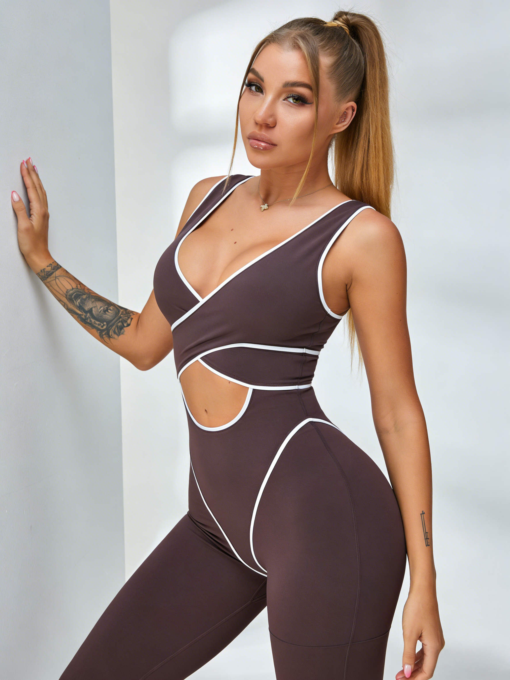 Crafted from buttery-soft, high-stretch fabric, it features eye-catching white contrast piping, a flattering wrap-front V-neck, and a strategic midriff cutout that accentuates your curves. The matching crisscross open back design delivers a head-turning silhouette, while the squat-proof bike short length offers full coverage for every workout.