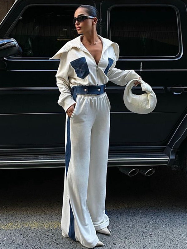 ZASUWA Female Sexy Denim Contrast Color Pocket Casual Tracksuit