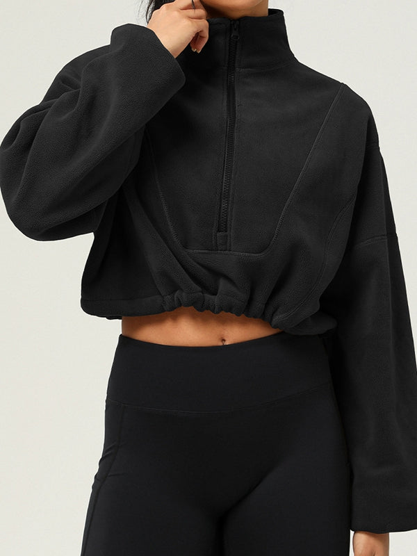 ZASUWA Female Fleece Half Zipper Drawstring Cropped Hoodie